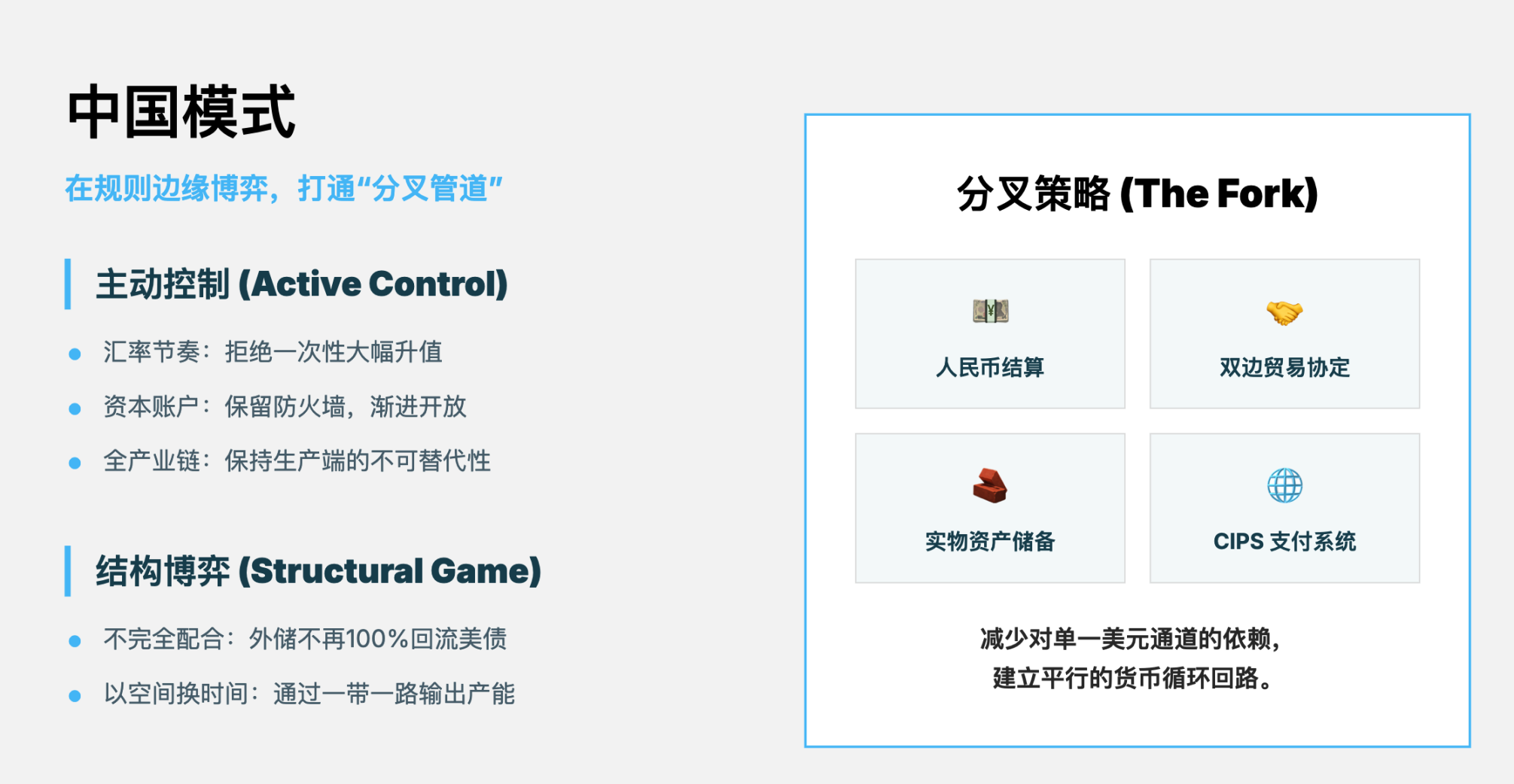 中国进入这一体系的时间更晚,所处的发展阶段和内部约束也与日本显著不同。面对顺差扩张与外部压力,中国并未完全选择通过价格和金融渠道迅速出清,而是在汇率管理、资本账户管制和产业升级的框架下,尽可能保留政策自主性。这一选择使中国长期处于争议之中,被指责为「扭曲规则」或「搭便车」,但从治理角度看,这更像是在既有体系内为内部转型争取时间和空间的策略安排,而非简单的制度套利。