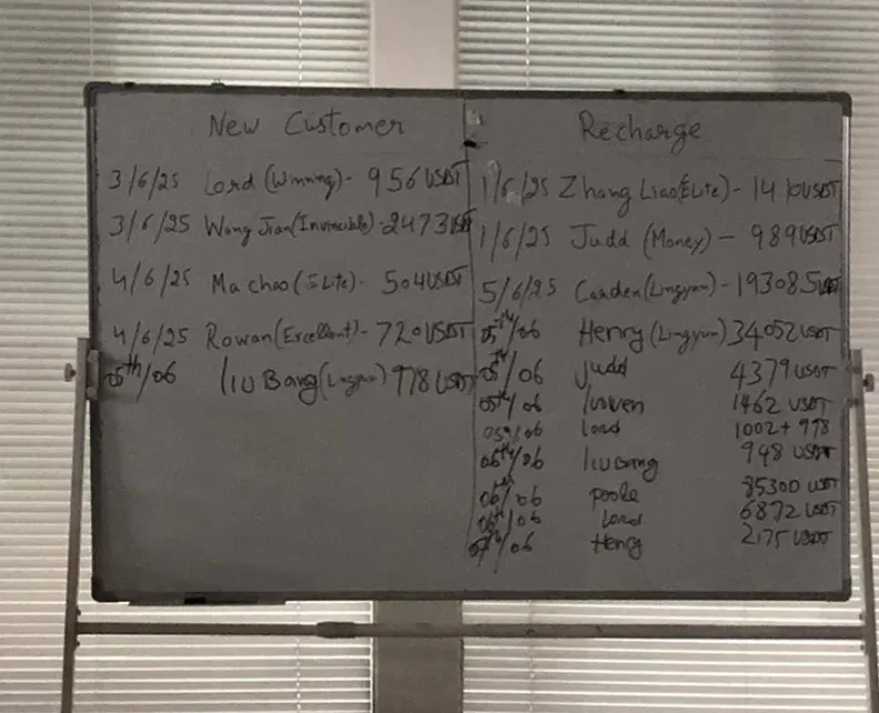 他开始源源不断地给我发来照片、截图和视频:一份电子表格,还有一块白板的照片,白板上记录着他所在团队的工作进度,许多成员的外号旁,都标注着数千美元的诈骗金额;办公室里立着一个中式礼鼓,一旦有人诈骗得手 10 万美元以上,这面鼓就会被敲响庆祝;一页又一页的聊天记录,发布在办公室的 WhatsApp 群里,记录着 Red Bull 同事们的诈骗战果,还有受害者们绝望的回复:「我一直梦想着,能有一个像你这样的女朋友,然后结婚」「你怎么不回我消息了」「我会一直为你妈妈祈祷」「求求你,帮我把钱取出来好不好」「?????」「😭」。还有一段视频,拍下了一名受害者在车里痛哭的画面,他被骗走了六位数的钱财;这名受害者把这段视频发给了诈骗者,或许是想唤起对方的愧疚之心,却没想到,视频在办公室里被传来传去,成为了众人的笑柄。
