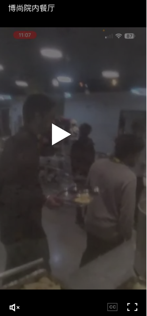 一段通过 Signal 通话秘密拍摄的视频,展示了博尚诈骗园区的食堂内部。Red Bull 说,这里的食物吃起来有股奇怪的化学味道。员工若有违规行为,哪怕只是上班迟到、点名时不在宿舍,都会被禁止进入食堂