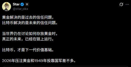 然而,在这种表面的繁荣之下,一种更为深刻、残酷的代际资产转移正在发生。正如 OKX Star 所言:“黄金解决的是过去的信任问题,而比特币解决的是未来的信任问题。2026 年压注黄金,和 1949 年投靠国军差不多。”