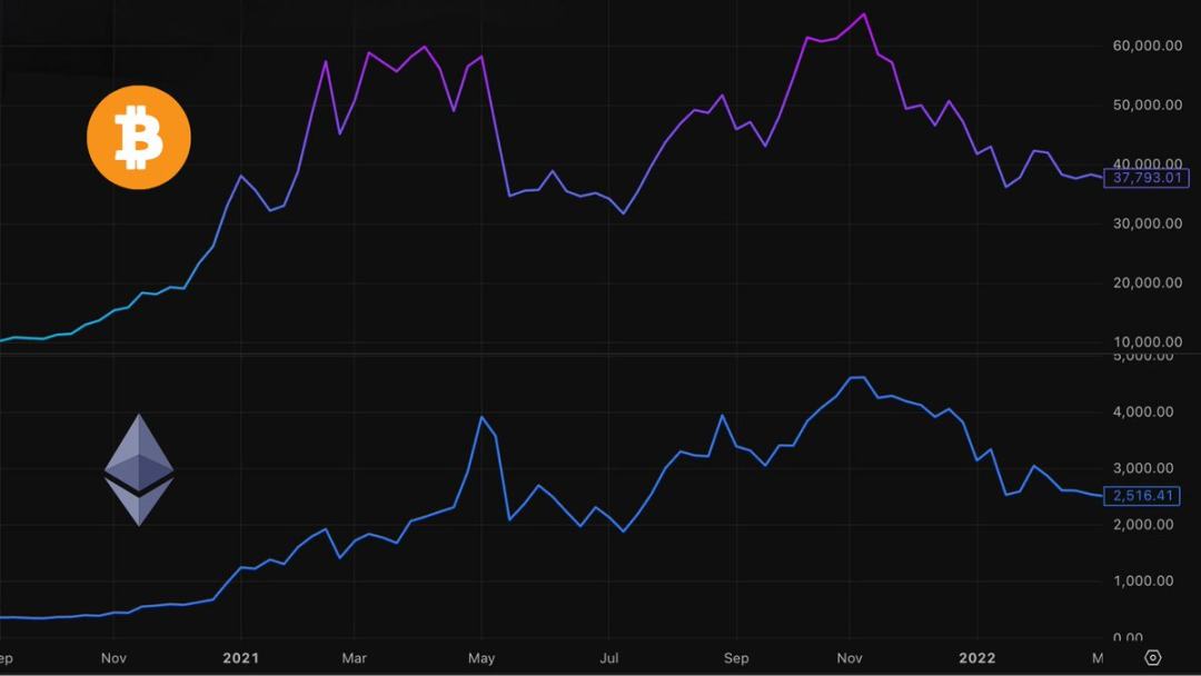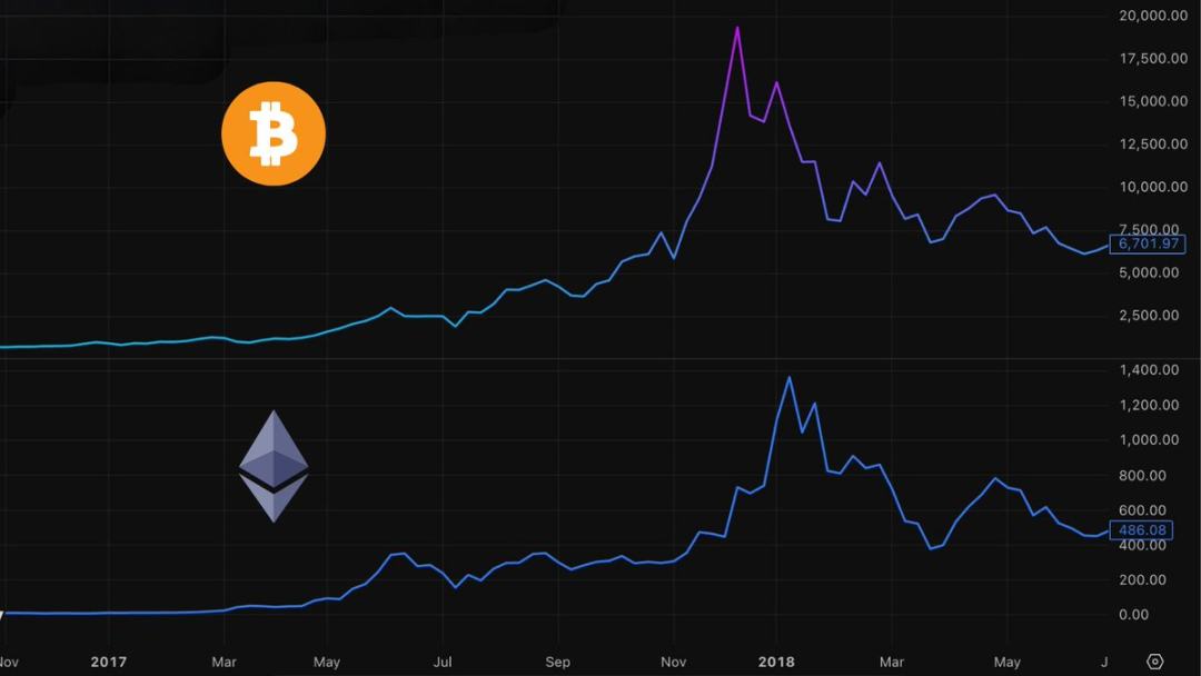 ICO 狂潮时期(2017 年中 - 2018 年中)的 BTC 与 ETH 价格