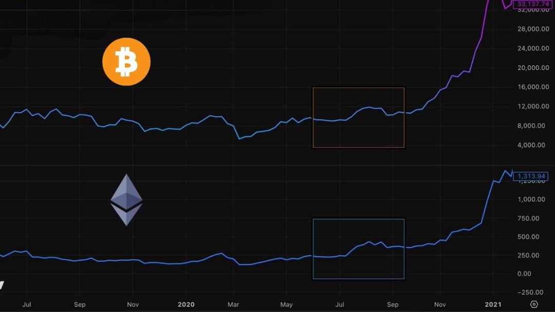 DeFi Summer 时期(2020 年 6 月 - 2020 年 9 月)的 BTC 与 ETH 价格