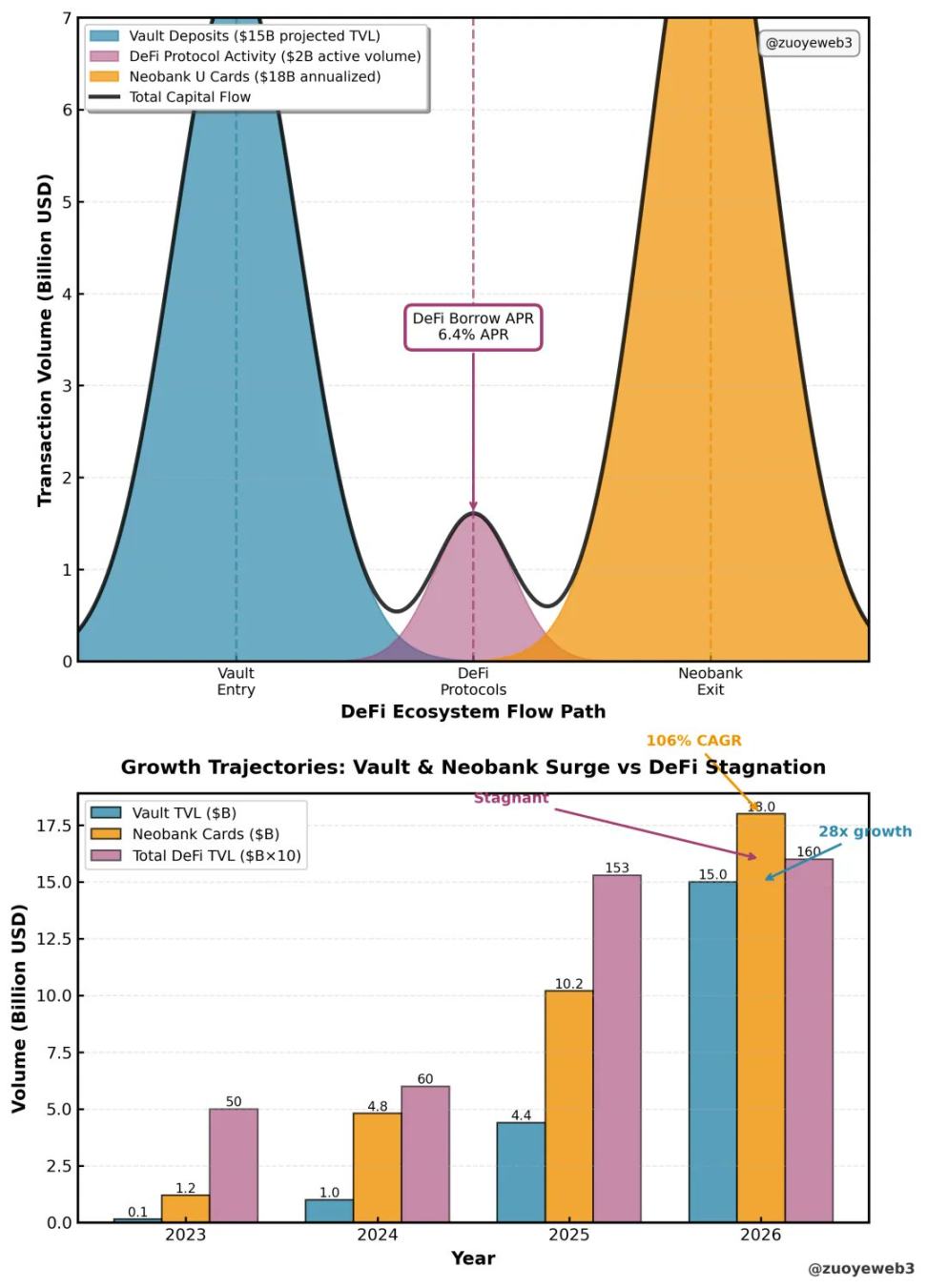 如果仔细绘制当前 DeFi 的形状,会是一个」头大尾大肚中空「的半成品,数不清的 DeFi Vault 争夺用户存款,但 Vault 不再相互缠绕以提高杠杆,甚至互相提防以避免存款流失,并且底层资产都是美债,最终流向为数众多的 Neobank。
