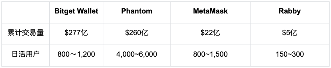 注:数据来源自 Dune,时间截至 2025 年 12 月 31 日;不同钱包在用户规模、交易频率与资产偏好上存在结构性差异,累计交易量与日活跃用户仅反映其在应用内永续合约交易场景中的相对位置