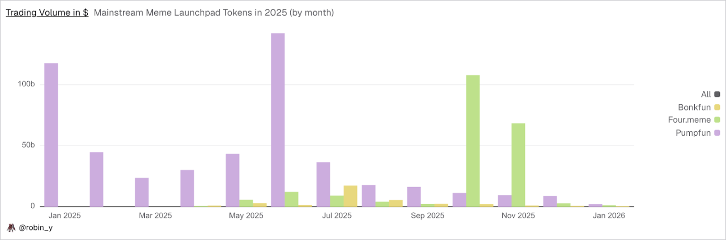 回顾 2025 年,Meme 仍然是链上最重要的注意力入口之一。特朗普发币、Web2 名人币、Pump.fun 直播,以及中文 Meme 浪潮等,先后构成了多轮不同量级的活跃周期,并在阶段性内释放出一定的财富效应。在这些结构性行情中,大量用户第一次下载钱包、第一次完成链上交易、第一次理解 Gas、滑点与失败率,Meme 成为用户进入链上世界最直接、门槛最低的起点。