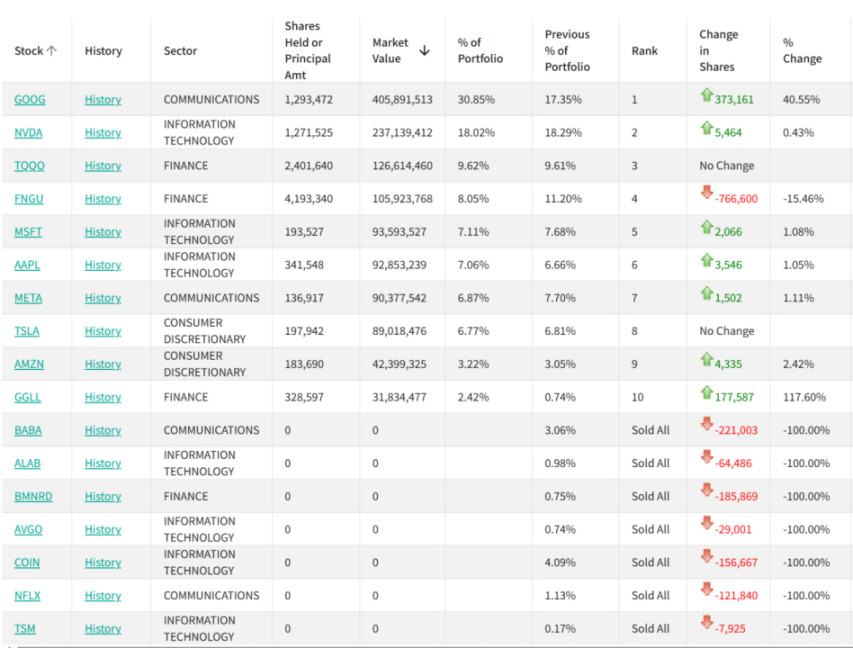 果然,去年第四季度,基金持仓给出了最终答案。不仅清仓了 Coinbase 和 BitMine,还一并告别了阿里巴巴、奈飞等多只股票。收回的「弹药」被猛烈地集中到了谷歌身上,使其成为绝对的第一重仓股。但斌的战线几乎全部压注在谷歌、英伟达、微软等 AI 核心巨头身上。
