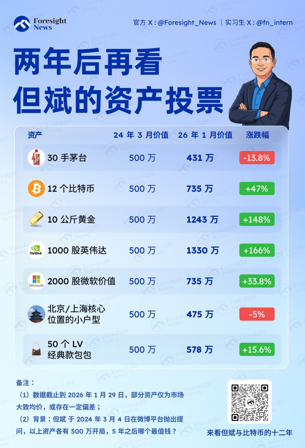 截止 1 月 29 日发稿前,30 手茅台价值 431 万人民币, 12 个比特币价值 735 万人民币,10 公斤黄金价值 1243 万人民币,10000 股(2024 年 6 月 7 日 1:10 拆股)英伟达价值 1330 万人民币,2000 股微软价值 735 万人民币,北京 / 上海核心位置的小户型价值 475 万人民币,50 个 LV 经典款包包(以平均年化 7.5% 计算)价值 578 万人民币。