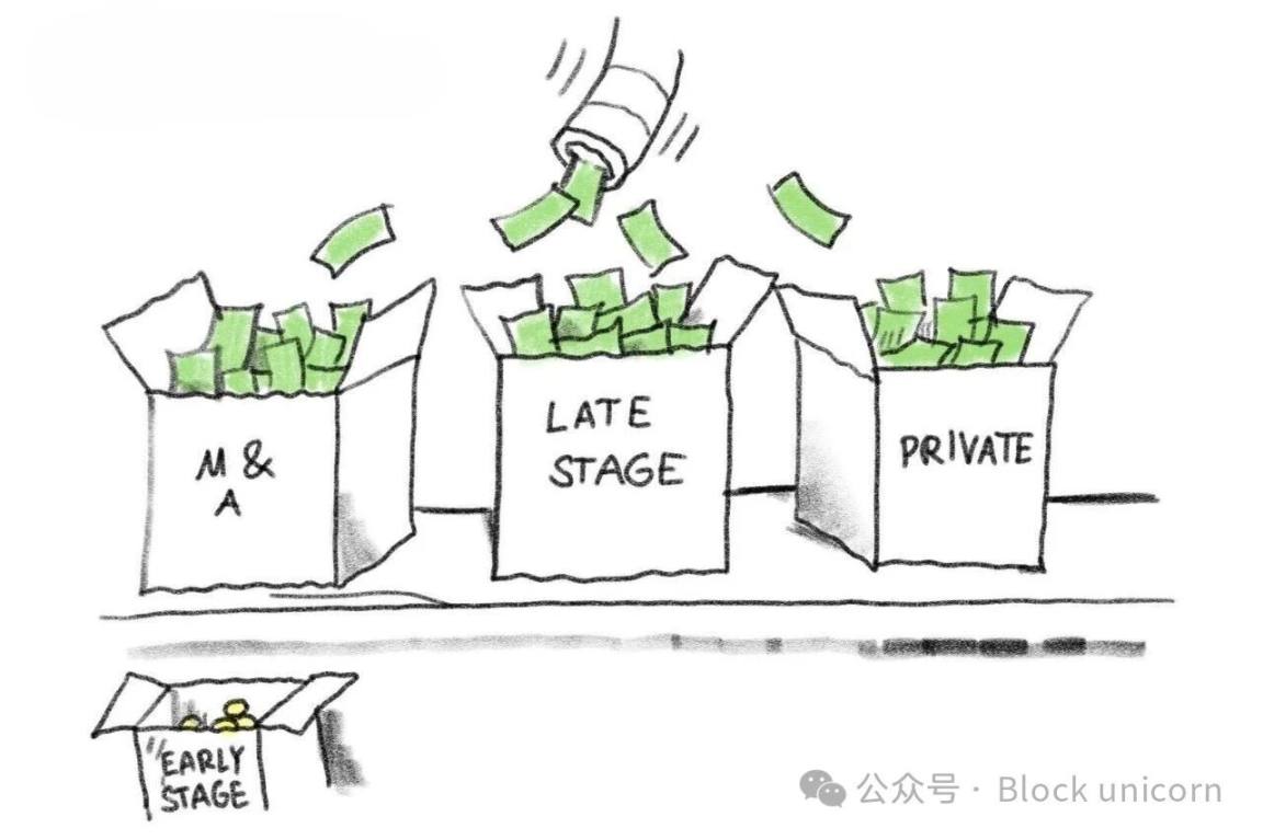 这一点,连同并购活动的激增,都表明了不同阶段的风险偏好正在发生变化。一方面,并购融资占所有「融资额」的 40% 以上,但这与通过风险投资注入的新资金不同,并非真正意义上的「新资金」。另一方面,后期融资之所以受到青睐,是因为其承销风险似乎较低,能够提供更高的确定性和更高的潜在投资回报率。