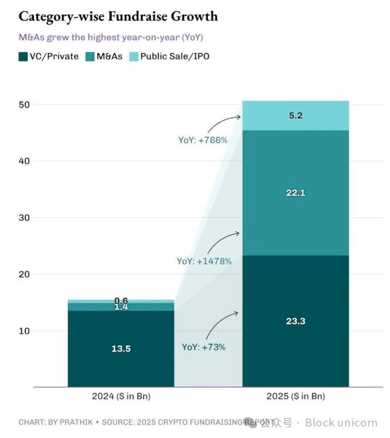 去年筹集的资金中超过 40% 来自并购,而 2024 年这一比例仅为 9%。尽管筹集的资金总额比上一年增长了两倍多,但 2025 年对于加密货币而言更像是一个整合之年。