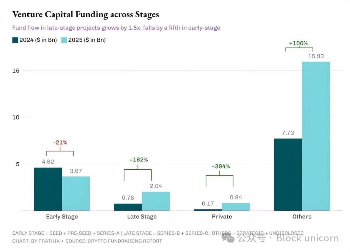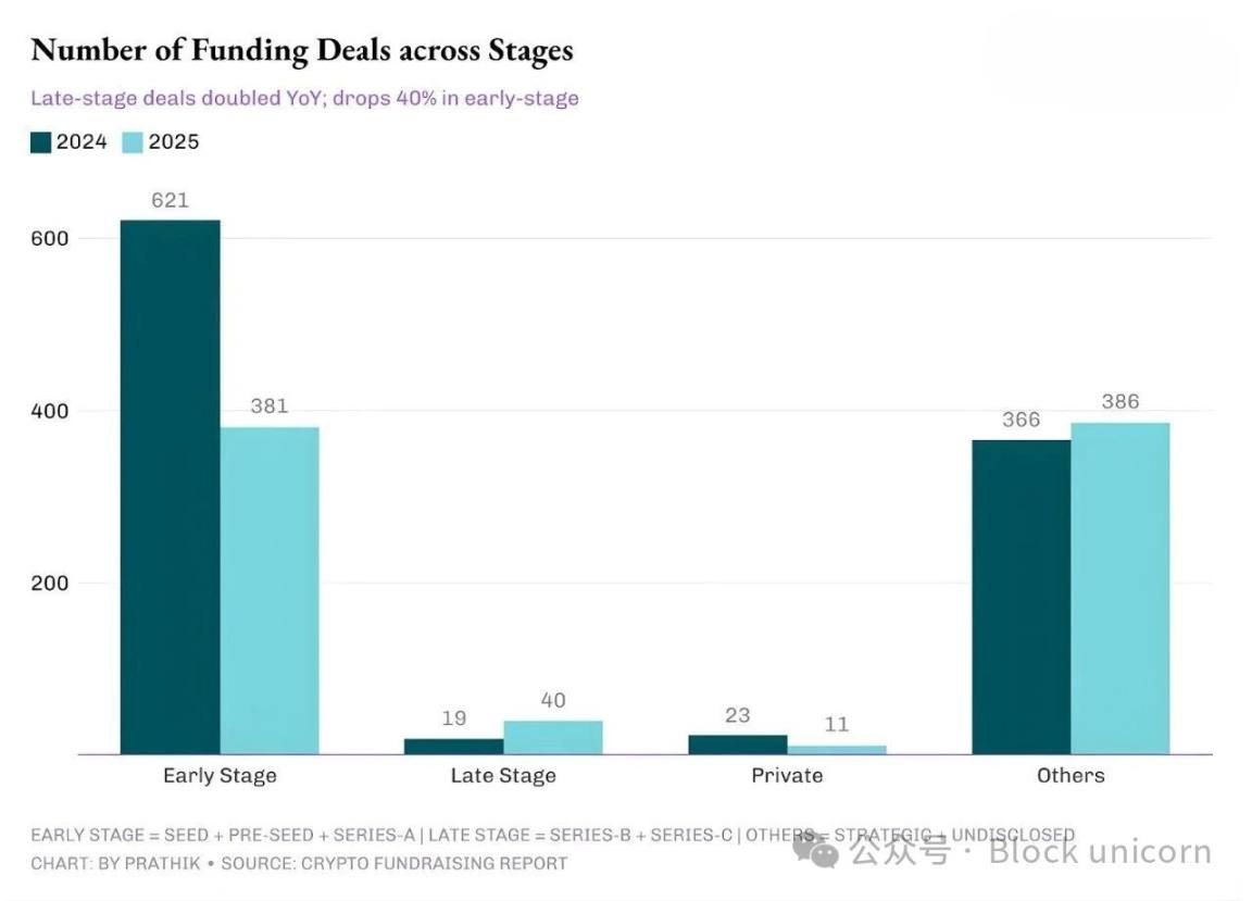 2024 年,风险投资机构的融资额占加密货币项目总融资额的 85% 以上,但 2025 年这一比例下滑至 46%。这一现象,以及风险投资机构去年在加密货币项目不同阶段的资金分配方式,令新兴加密货币开发者和创始人感到担忧。2025 年,风险投资机构开出的支票数量远少于以往,但金额却更大,这些支票主要用于资助已发展到后期阶段的现有项目,而非资助新兴的早期项目。