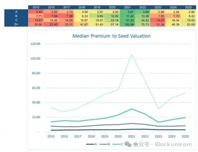 这种转变促使理性的资本配置者将资金重新分配到风险较低的机会上,例如 A 轮和 B 轮项目,这些项目所需的估值溢价低于种子轮、种子前轮、C 轮和 D 轮及以上项目。