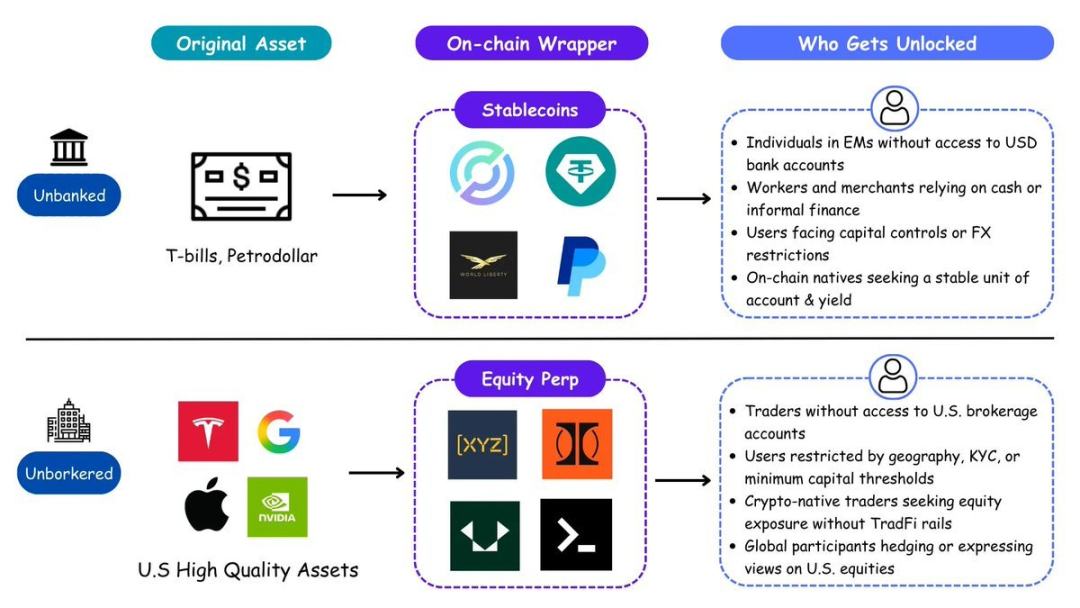 美国输出金融,从不是靠输出金融机构本身,而是靠输出「访问权」。石油美元体系通过全球分发美元,将通胀压力外溢;稳定币复制了这一逻辑,通过批发美债,把全世界变成了新的美元持有者,而不需要银行或经纪商的参与。链上股票是这套逻辑的下一步。从 unbanked 到 unbrokered,美元资产将再次完成对全球的倾销。