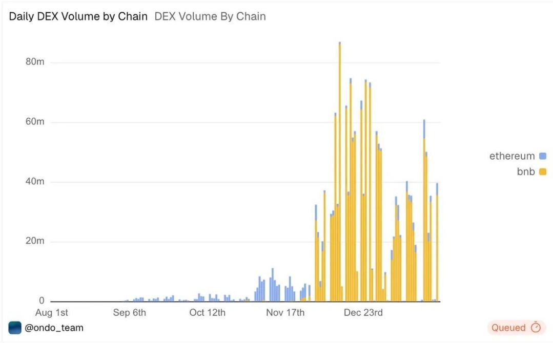第一波真实需求,来自无法接入美国券商体系的交易者,以及希望在不依赖 TradFi 基础设施的情况下获得美股敞口的 crypto 原生用户。发行方完成了最重的合规与托管工作,但资金流向了真正掌握交易注意力和分发能力的一侧。离岸平台将产品直接嵌入交易界面,交易量自然随之聚集。最终,我们看到绝大多数代币化股票的交易量集中在 BNB Chain 上,占比超过 80%。