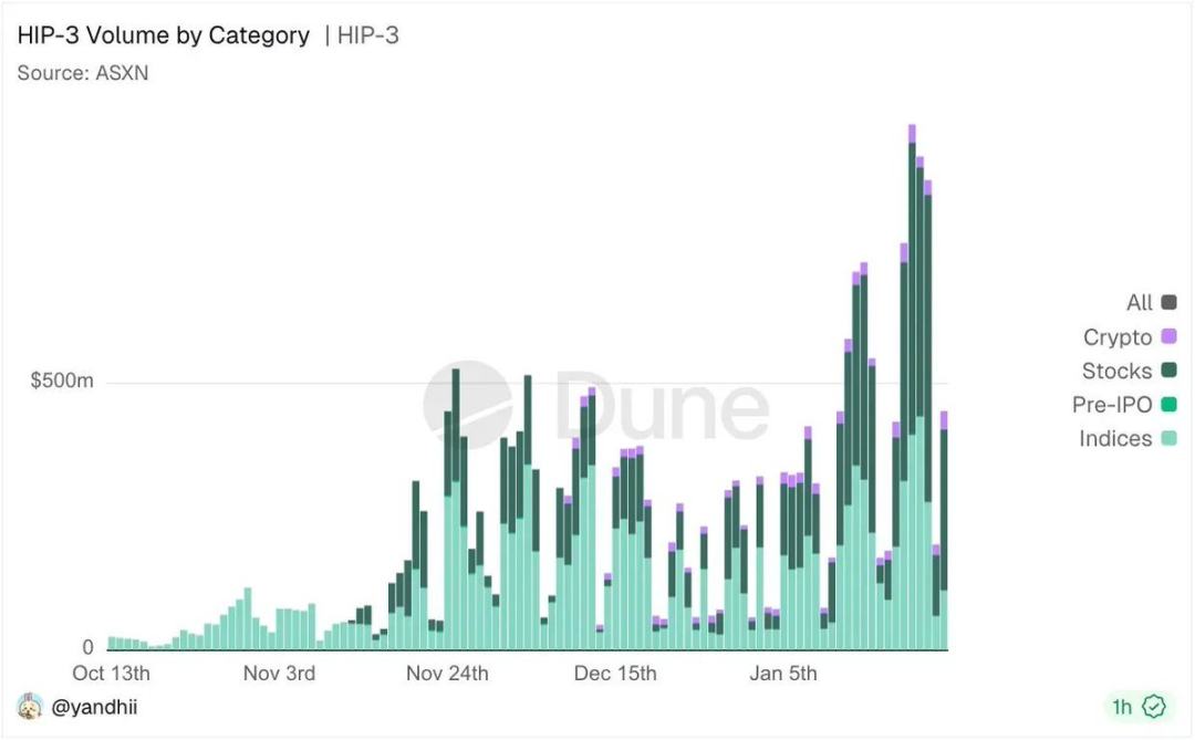 如果说离岸现货解锁了零售需求,链上 equity perp 则进一步吸引了专业交易者的流量。这些用户是全球化的交易参与者,他们希望对美国股票进行交易或对冲而不受制于券商准入、交易时段或司法辖区限制。以 HIP-3 为例,它为专业交易者提供了一个可以系统性做 basis trading、捕捉跨市场错位、同时覆盖股票、加密资产和指数的交易界面。在潜在空投激励的叠加下,交易量不断刷新新高。