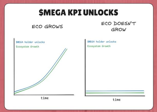 这意味着,在生态系统停滞的熊市情况下,至少不会有大量新增代币流入市场、稀释现有持币者。只有当 MegaETH 生态系统真正实现增长(由 KPI 定义)时,MEGA 代币才会逐步释放。