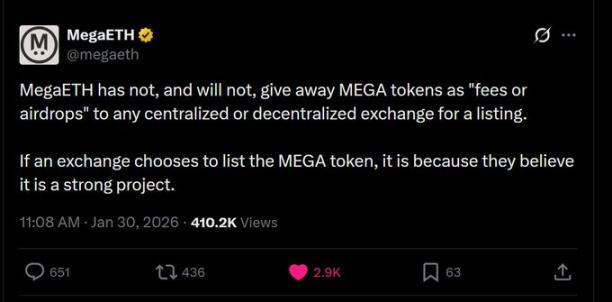 类似的理念也体现在 MegaETH 对待交易所上线的态度上。此前币安上线 MEGA 期货时(这类操作常被视作交易所向项目方施压索取代币的手段),MegaETH 保持了克制与策略性。