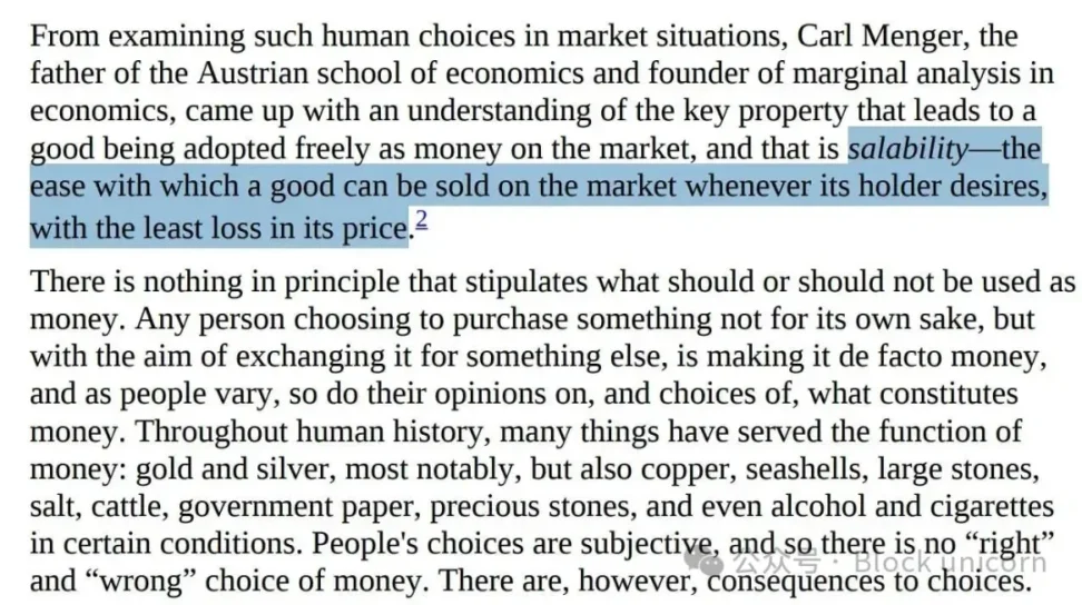 阿穆斯反复强调「可售性」(Salability)的概念。一种好的货币类资产应该能够随时随地轻松出售,且不会造成巨大损失。要具备可售性,它必须满足三个条件:跨空间——这样你就可以随身携带,并用它来交换所需之物;跨时间——这样它就不会腐烂或价值崩塌;跨规模——这样它就可以用于任何用途,从一杯茶到一栋房子,而无需计算器或一大袋零钱。
