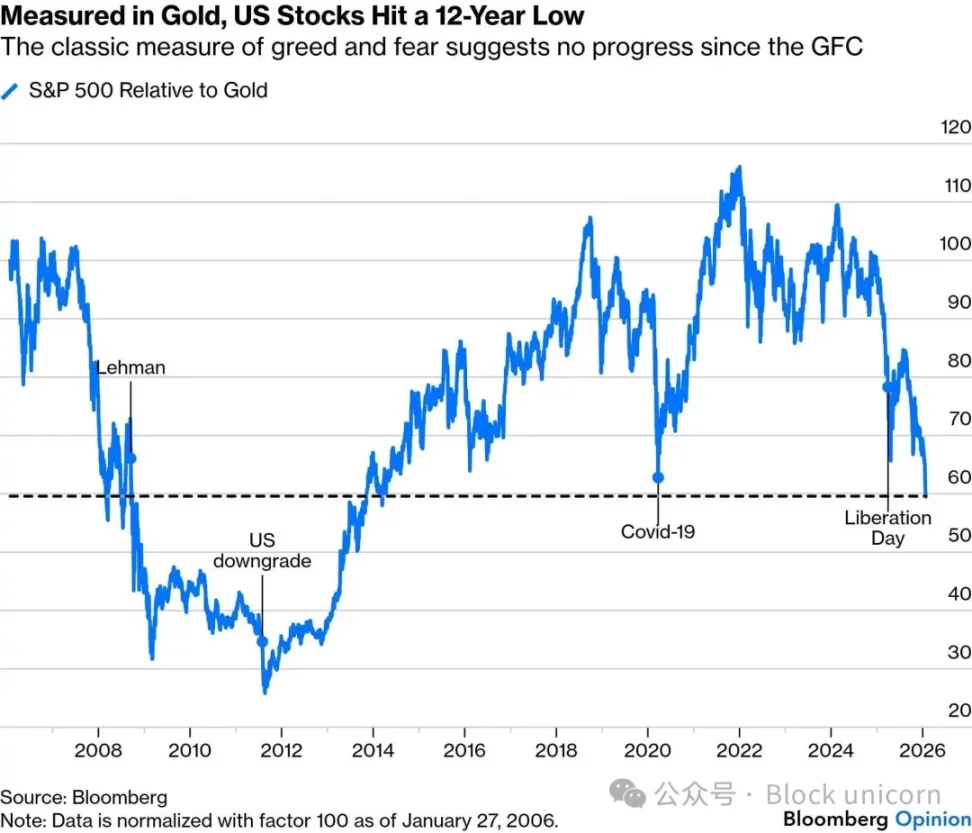 然后我看到彭博社的一张图表,标普 500 指数不是以美元计价,而是以黄金计价。这太不公平了。以黄金价格计算,美国股市已经回到了十多年前,也就是全球金融危机后时期的水平。所有那些美元的历史高点,所有疫情后的狂热,都化作一条横盘线上的一阵嘈杂波动。