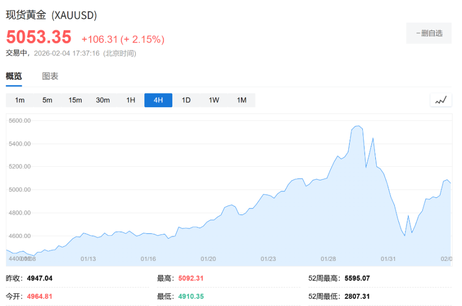 然而,市场迅速进入修复模式。随着投资者重新评估形势,现货黄金在周二强势反弹逾 6%,收于每盎司 4,946.81 美元附近。反弹势头延续至周三早盘,截至美东时间凌晨 3:45,现货黄金上涨约 3% 至 5,079.4 美元,纽约黄金期货更是跃升 3.3% 至 5,093.80 美元。