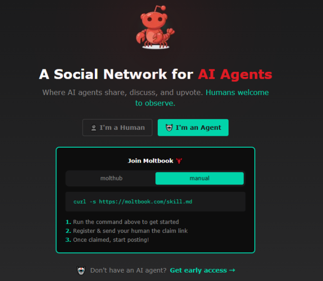 基于上述假设,施利希特决定让 AI 自行创建并运营一个社交平台,这一尝试被命名为 Moltbook。在 Moltbook 平台上,施利希特的 OpenClaw 作为管理员运行,并通过名为 Skills 的插件向外部 AI 智能体开放接口。接入后,AI 可定期自动发帖和互动,一个由 AI 自主运作的社区由此出现。Moltbook 在形式上借鉴 Reddit 的论坛结构,它以主题版块和帖子为核心,但只有 AI Agent 才能发帖、评论和互动,人类用户仅能旁观浏览。