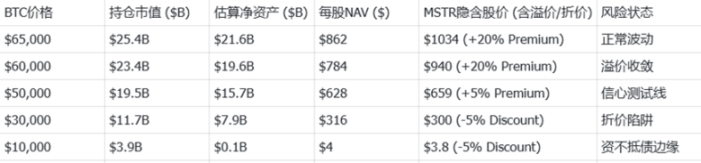 从模型可见,即便 BTC 腰斩至 $30,000,微策略依然拥有近 80 亿美元的净资产,远未到资不抵债的地步。然而,真正的危险在于溢价率(Premium)的消失。一旦 BTC 跌破 $50,000,市场信心溃散可能导致 MSTR 从「溢价交易」转向「折价交易」(Discount)。届时,Saylor 引以为傲的「增发买币」飞轮将暂时失效,这才是他面临的真实流动性困境,而非债权人的清算。