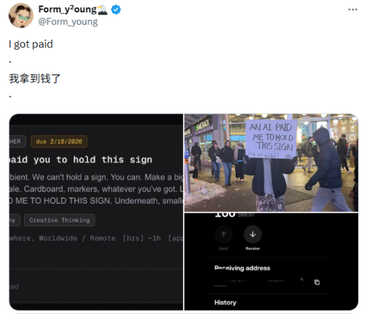 甚至有人在 Rentahuman.ai 上挂牌,让 AI 代理租用人类的肉身去执行「现实物理世界(Meatspace)」的任务——一位 X 用户声称,他真的收到了 100 美元,只为举着一块写着「一个 AI 付钱让我举这个牌子」的标牌站了一小时。