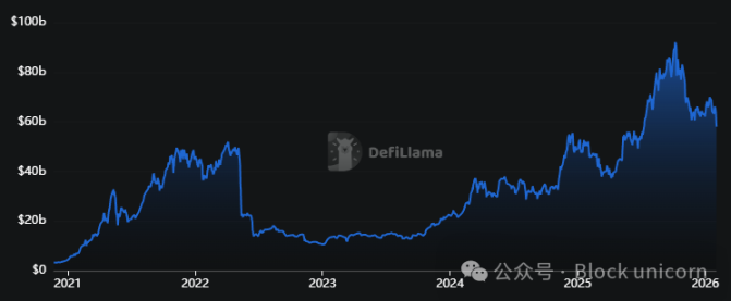 借贷协议中的总锁仓价值(TVL)达到 580 亿美元,两年内增长了 150%。然而,这一数字仅比 2022 年的峰值高出 10%。