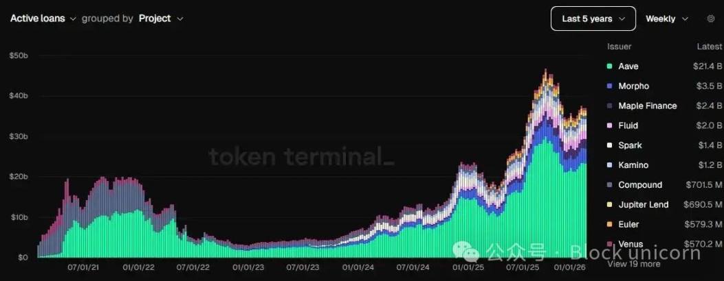 仪表盘显示,包括 Aave 和 Morpho 在内的现有机构奠定了坚实的基础,过去几个月的活跃贷款超过 400 亿美元,是 2022 年最高水平的两倍多。