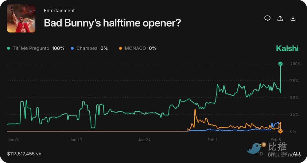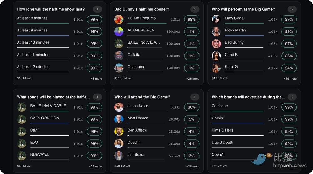 两大预测市场平台 Kalshi 和 Polymarket 都围绕这场比赛、中场秀、广告等开设了市场,初步数据描绘了一幅有趣且复杂的画面。