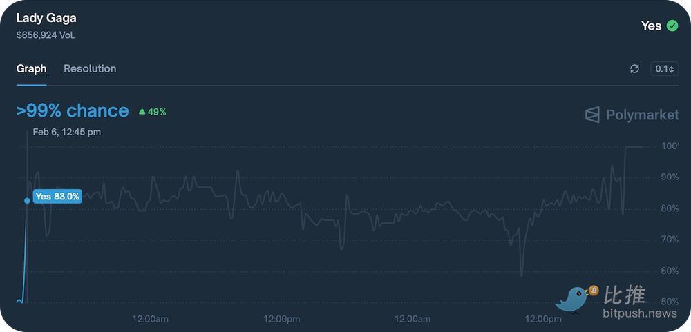 不过,Polymarket 真正突出之处在于其主要使用场景——信息发现。其中场秀表演者市场中,Lady Gaga 在赛前几天内概率一直稳定在 80% 左右——这远远早于她在中场秀上的意外亮相,《公告牌》杂志此前并无相关报道,也确实让所有和我一起观看的人大吃一惊。