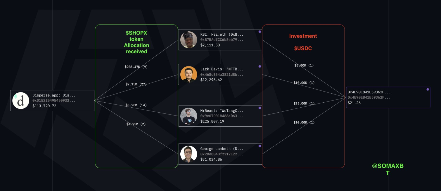 据 SomaXBT 称,MrBeast 向该项目投资了 10 万美元,并获得了 100 万个 SUPER 代币作为回报。在他投资之后,代币价格飙升,MrBeast 于 2021 年 3 月 30 日将其 SUPER 代币转移到一个备用钱包,在那里,这些代币被通过一系列交易抛售,总计 1,900 ETH(当时约合 370 万美元)。MrBeast 根据一份归属合同获得了额外的 SUPER 代币,随后他又以 550 万美元的价格将其出售,使他从该项目中获得的总收入达到约 900 万美元。