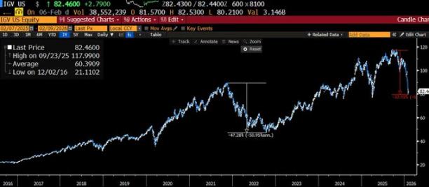 IGV(iShares 科技软件 ETF,最接近「一键投资软件板块」的工具)从九月高点跌了 30%,从 118 美元跌至 82 美元。