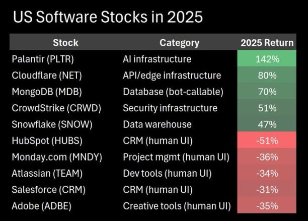 2025 年的回报已经说明了问题——市场其实知道,只是还没说透:人类界面 SaaS 正在被摧毁,机器基础设施 SaaS 却在飙涨。IGV 同时包含两者,所以它无法代表任何一方的真实走势。