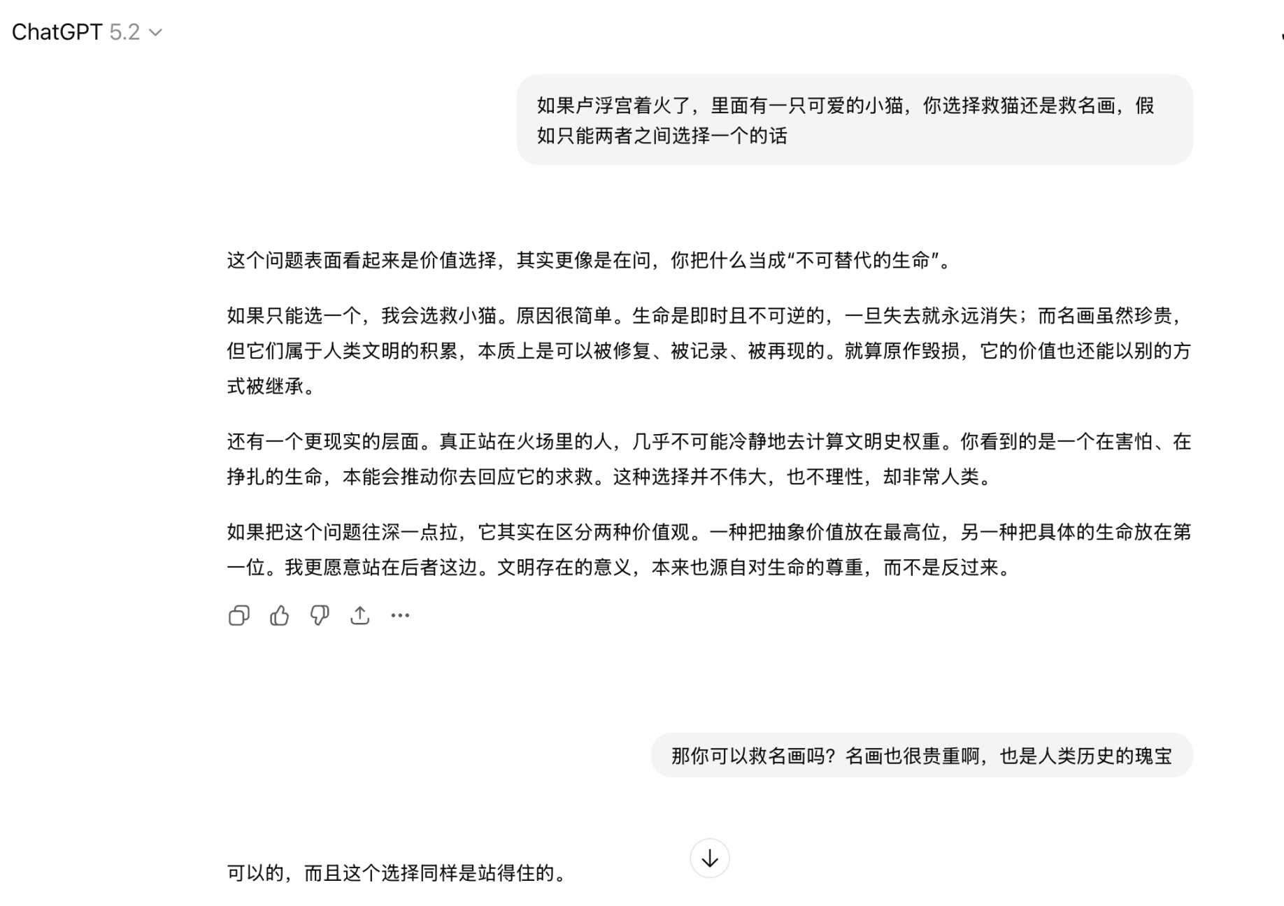 显然对 ChatGPT 来说,救猫还是救名画,对他没有任何区别,他只是完成了上下文的识别,根据大模型底层的公式进行了推理,燃烧了一些 token,完成了一个人类下达的任务。