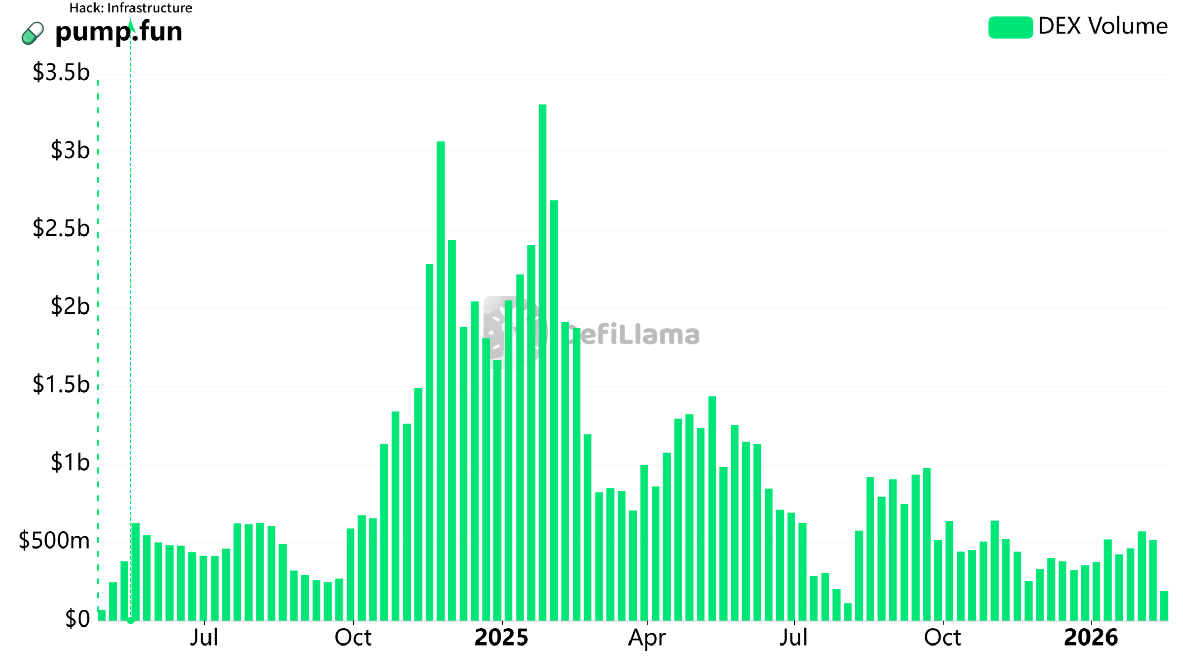 Defilama 数据显示,Meme 平台 pump.fun 在 2025 年前后数月,其交易额达到了历史新高。周交易量两次超过 30 亿美元,随后便是一路下滑,2026 年年初其交易额均在 5 亿美元附近徘徊,是其巅峰的 1/6。
