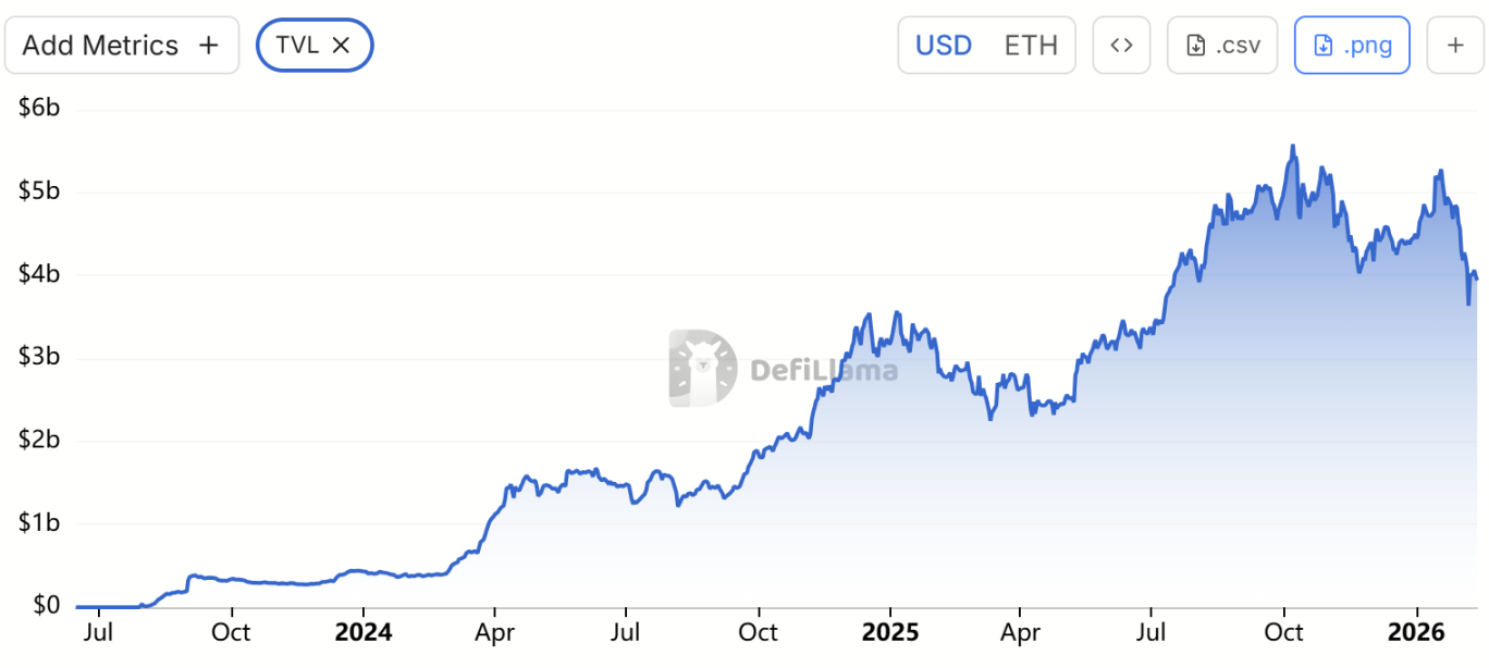 另一崛起的竞争对手 Base 也在飞速成长,尤其以 AI 代币吸引不少用户。据 DefiLlama 数据显示,目前其 TVL 仍维持在 40 亿美元的高位。