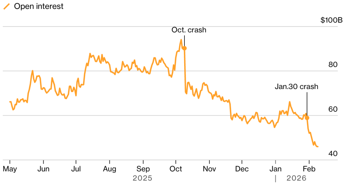 比特币永续期货未平仓合约自去年 10 月开始下滑后始终未能反弹,凸显本轮反弹缺乏信心支撑。Coinglass 数据显示,其较 10 月高点已下跌约 50%。