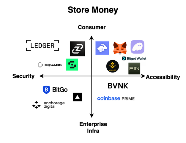 要真正自我托管加密资产、跟区块链交互,你得有个钱包。加密钱包这张地图,大致可以切两刀:一刀是「安全 vs 易用」,一刀是「消费级 vs 企业级」。每个象限都跑出了有分发能力的赢家——Ledger 吃下安全向的消费级硬件钱包;Fireblocks、Anchorage 吃下安全向的企业级钱包基建;MetaMask、Phantom、Privy 主攻易用向的消费级钱包;Turnkey、Coinbase Prime 则拿下了易用向的企业级基建。