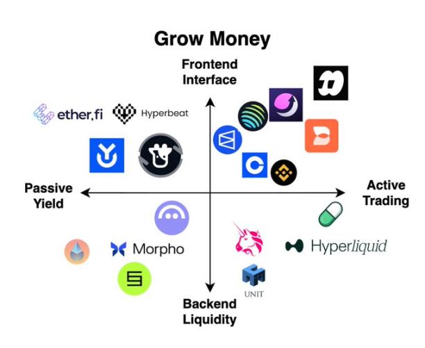 加密数字银行和用户的第三种关系,是「帮用户生钱」。这也是加密行业创新密度最高的一块——质押金库、永续合约、代币发行平台、预测市场,好几个从 0 到 1 的发明都落在这里。和前面一样,这张地图也可以切两刀:被动收息 vs 主动交易,前端界面 vs 后端流动性。