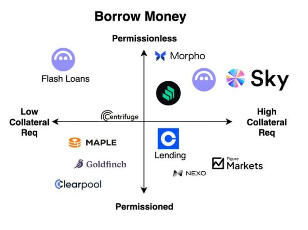 今天加密借贷的主流,还是无需许可、链上超额抵押。Aave、Morpho、Sky(原 MakerDAO)这些 DeFi 巨头,信仰「代码即法律」。区块链拿不到你的 FICO 分,也没有过往信用记录可查,那就用超额抵押来保证偿付能力[22]——牺牲资金效率,换的是无门槛准入和抗违约安全垫。Morpho 代表了这类模型的新一代演进[23]:模块化、无需许可、风险定价更精细,资金效率更高。