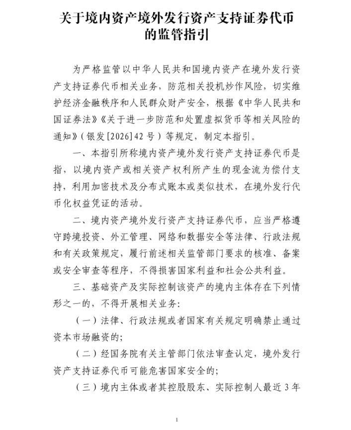 近期,一份名为《关于境内资产境外发行资产支持证券代币的监管指引》的文件引发市场高度关注。作为 2026 年证监会发布的第 1 号文,它首次从制度层面明确: