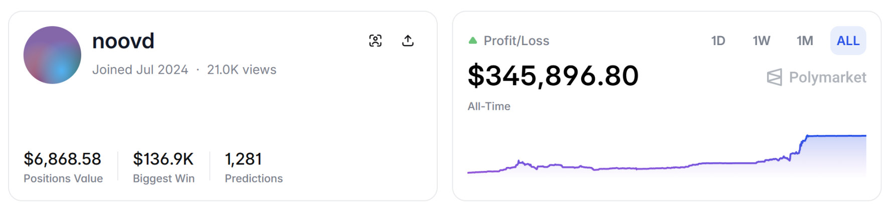 官方主页显示,2024 年 7 月他才入场,如今已经净赚 34.5 万美元。这位玩家总共做了 1281 笔预测,最大单笔赢过 13.6 万美元,现在手里还握着 6877 刀的仓位。