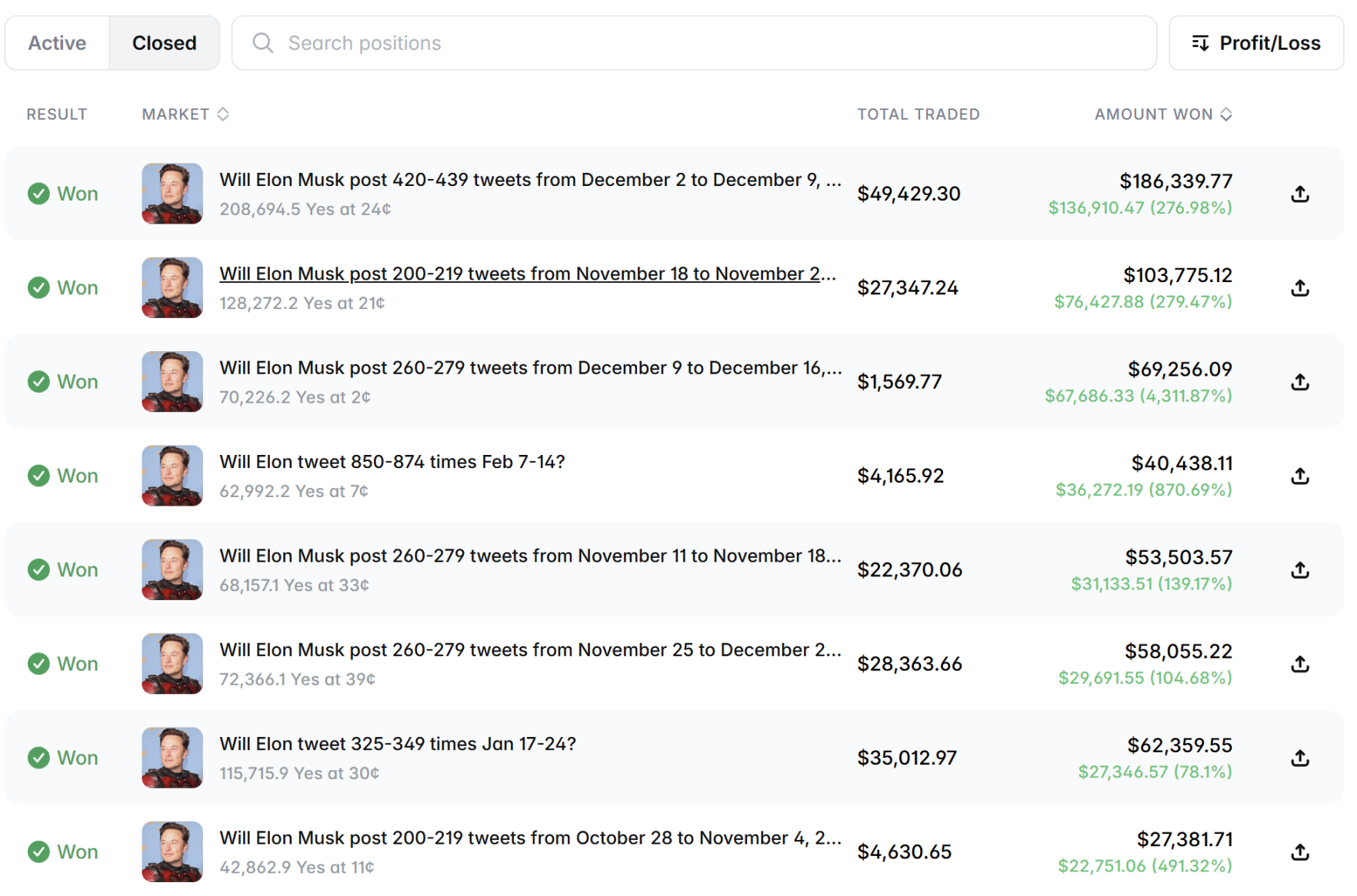 他不猜 NBA 比分,也不去下注各类政治事件,就认准了这一个赛道。打开他的已结算记录,前八大盈利全是「本周马斯克会发 X 到 Y 条推文吗」的 Yes。