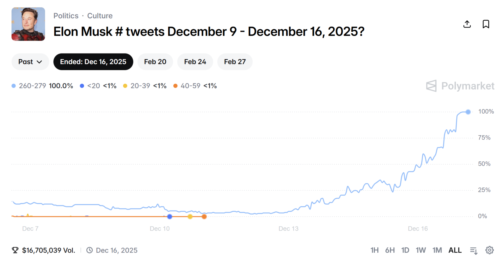 拿 2025 年 12 月 9-16 日预测来说,当时周三晚上马斯克已经发了 130 多条,剩下四天需要每天 32-35 条,就能精准卡进 260-279 这个区间。那周没有爆炸性新闻,但 xAI 和特斯拉的讨论一直在持续。市场却只给这个区间极低价格,因为大家觉得「要么平淡 180-220,要么直接冲 400+」。
