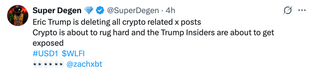 在这场「因为删推引发的血案」之后,一些 WLFI 的支持者或者吃瓜群众表示,确实在 X 上看到了很多关于「Eric Trump」删光了所有 Crypto 相关推文的帖子,但实际上 Eric 的账号仅仅是取消了转推 WLFI 官方发布的「会有更多 USD1 交易对上线币安」的内容,并未批量删除推文。