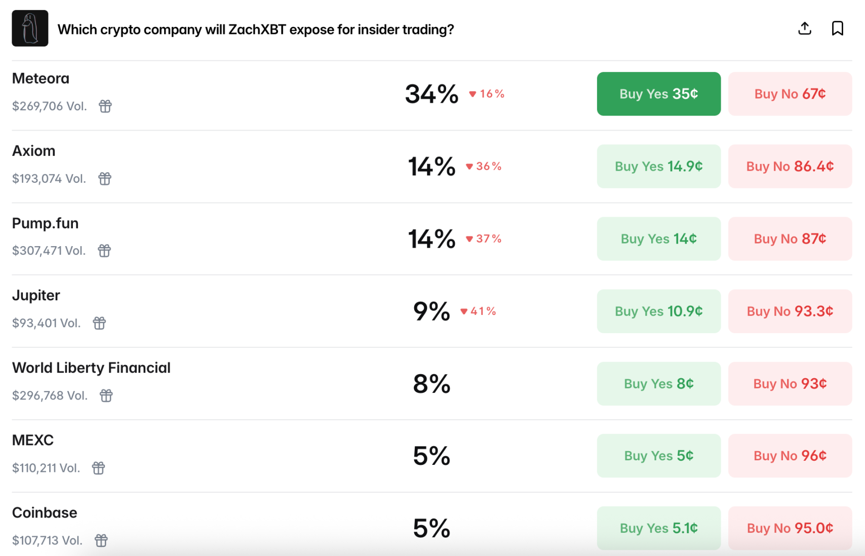 鉴于时间上的巧合,很多人自然将「ZachXBT 爆料」和「Eric Trump 删推」联系在了一起,认为 WLFI 是在提前删除一些证据。但 Polymarket 上的数据显示,大家似乎并不认为 WLFI 是将被爆料的目标。