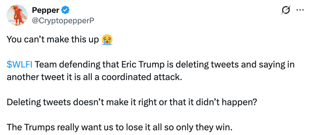可能 Eric Trump 只是误点了取消转推的按钮,但 CT 脑补了无数种阴谋论,为 Eric Trump 的行为强加了大量「背后的原因」。Crypto 的散户们已经被折磨得一朝被蛇咬,十年怕井绳,类似 WLFI 官方这种漏洞百出的辟谣,如果不是在当下的市场环境,可能根本不会发酵。