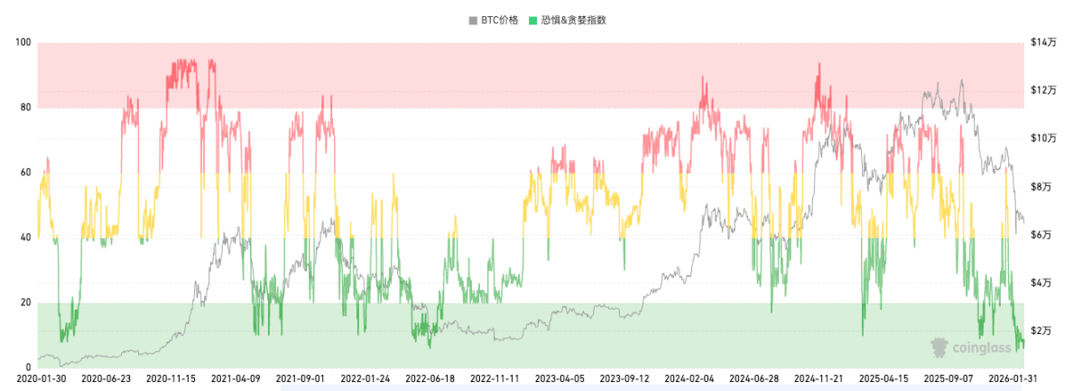据 Coinglass 数据,过去 24 小时内,加密市场总爆仓金额高达 3.27 亿美元,其中多单爆仓 2.34 亿美元。恐慌指数目前报 9,处于 「极端恐惧」 区间。从历史数据也能看出,目前恐慌指数已在低于 10 的历史低点区间多日徘徊。