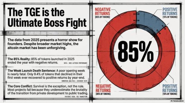 Arrakis Research 统计了 2025 年的数据,结果毫不含糊:85% 的代币发行项目最终以负收益告终。