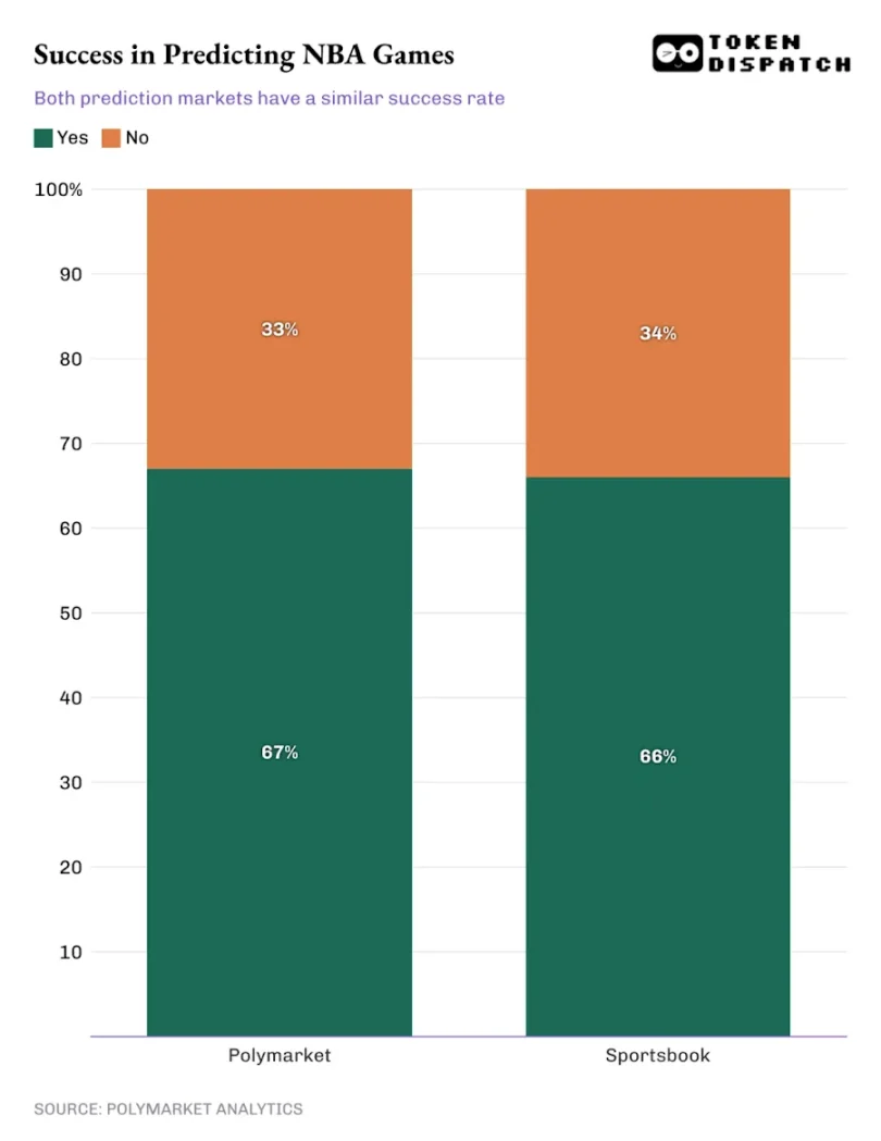大量研究表明,基于市场的赔率是现实结果的强力预测器。几十年来针对体育博彩市场的学术研究显示,庄家赔率对比赛结果的预测效率极高。更近一些,预测市场与传统体育博彩直接对比:在 2024–25 赛季约 1000 场 NBA 比赛的研究中,Polymarket 与传统博彩平台的预测成功率几乎一致。